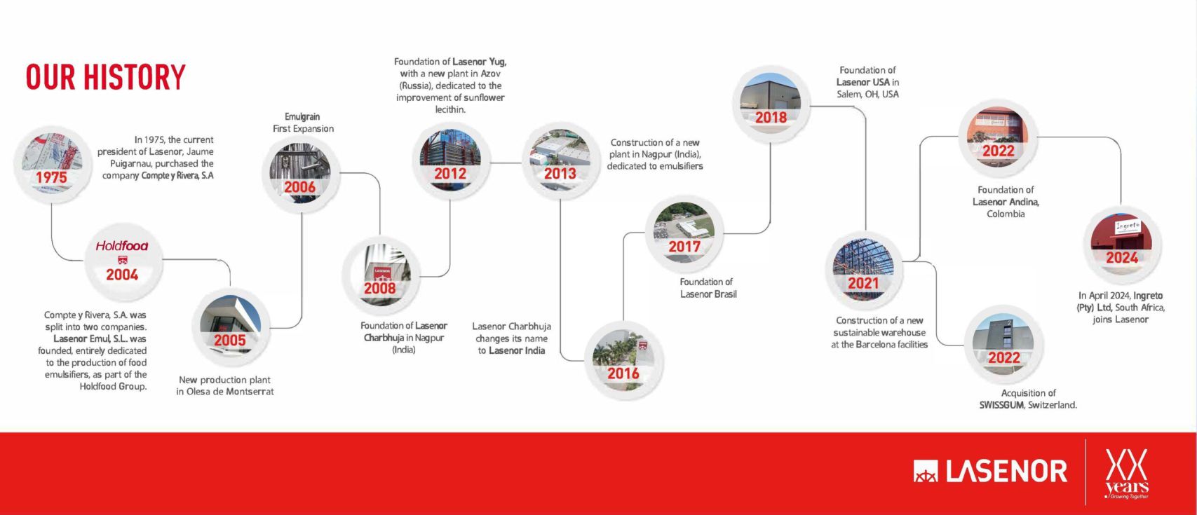 Since then, Lasenor has experienced impressive growth, evolving from a local agri-food company into a multinational with production plants in Olesa de Montserrat (Spain), Nagpur (India), Azov (Russia), Potim (Brazil), Salem (USA), and Cali (Colombia). In December 2022, we acquired the Swiss company Swissgum, specializing in stabilizing systems for various markets, especially ice cream and dairy products. During 2023, we laid the groundwork for a significant step that will materialize in 2024: the incorporation of a new manufacturing plant in South Africa, Lasenor Ingreto (Pty) Ltd, into the Lasenor Group.